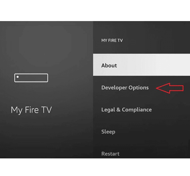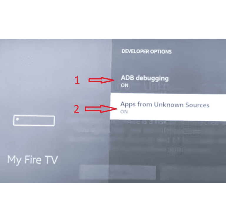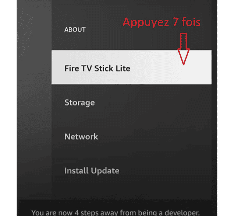 3- Si l’option Developer Options n’apparaît pas dans le menu des paramètres ; allez dans My Fire TV, puis About et cliquez 7 fois sur Fire Tv Stick Lite pour activer l’option développeur sur l’appareil. Ensuite, en revenant en arrière, vous trouverez Developer Option disponible dans le menu. Activez les 2 options mentionnées ci-dessus : ADB debugging and Apps from Unknown Sources en les mettant sur ON