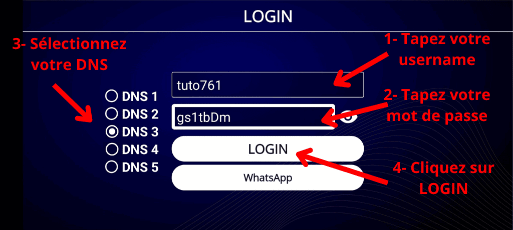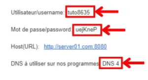 Remarque: Vous devez mettre les codes d’accès et le numéro DNS que vous avez reçus par mail après votre achat, les infos sur ce tutoriel ne sont qu’on exemple.