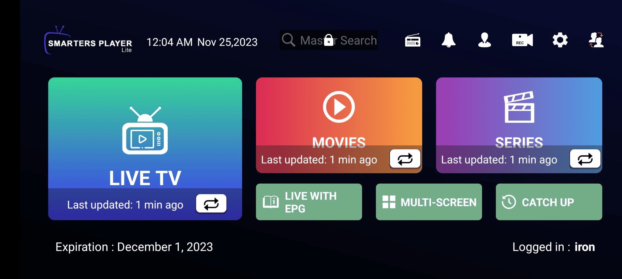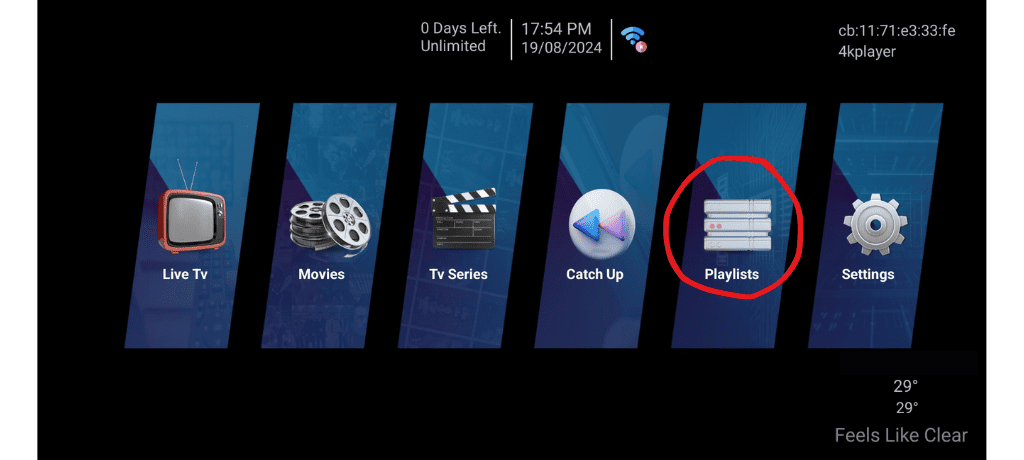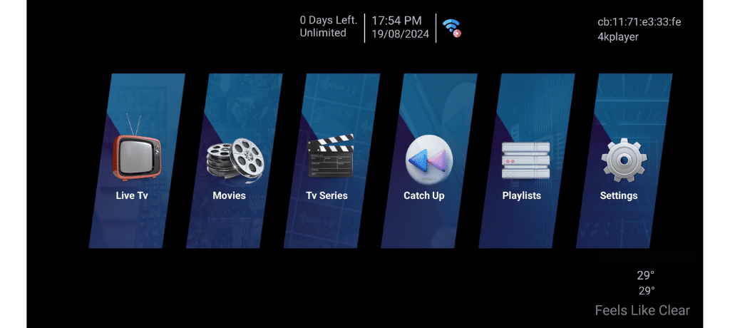 5- Une fois qu'on aura configuré votre application avec votre abonnement IPTV, On vous demandera de redèmarrer l'application et vous aurez accès à cette interface principale.