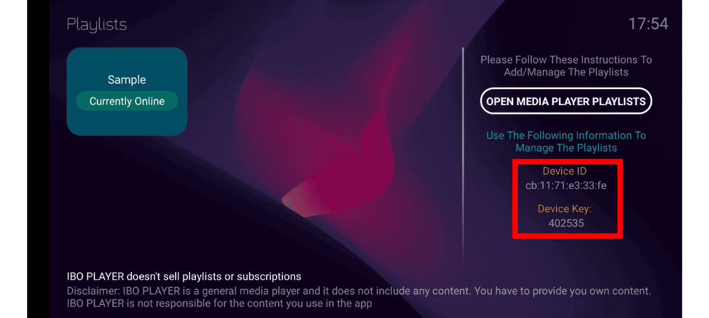 L'adresse mac et le device key sera affiché à droite de l'écran