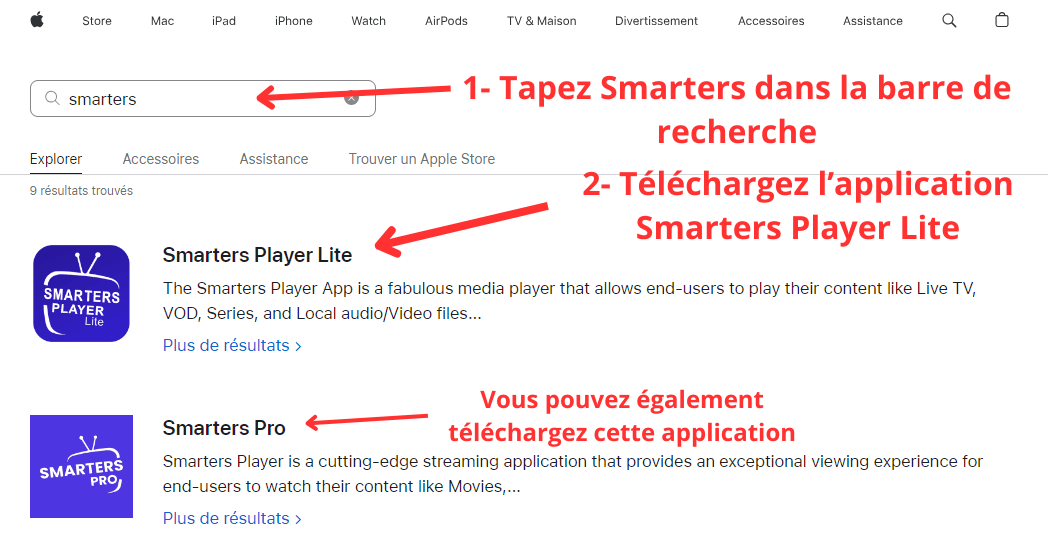 1- Allez simplement sur l'app store et tapez IPTV Smarters dans la barre de recherche. Ensuite Téléchargez l'application