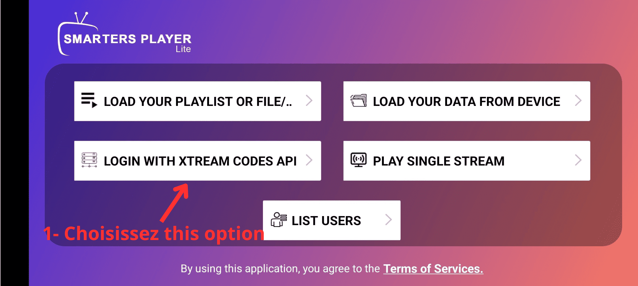 2- Après avoir installé et lancé l'application, vous verrez cette interface : choisissez l'option LOGIN WITH XTREAM CODES.