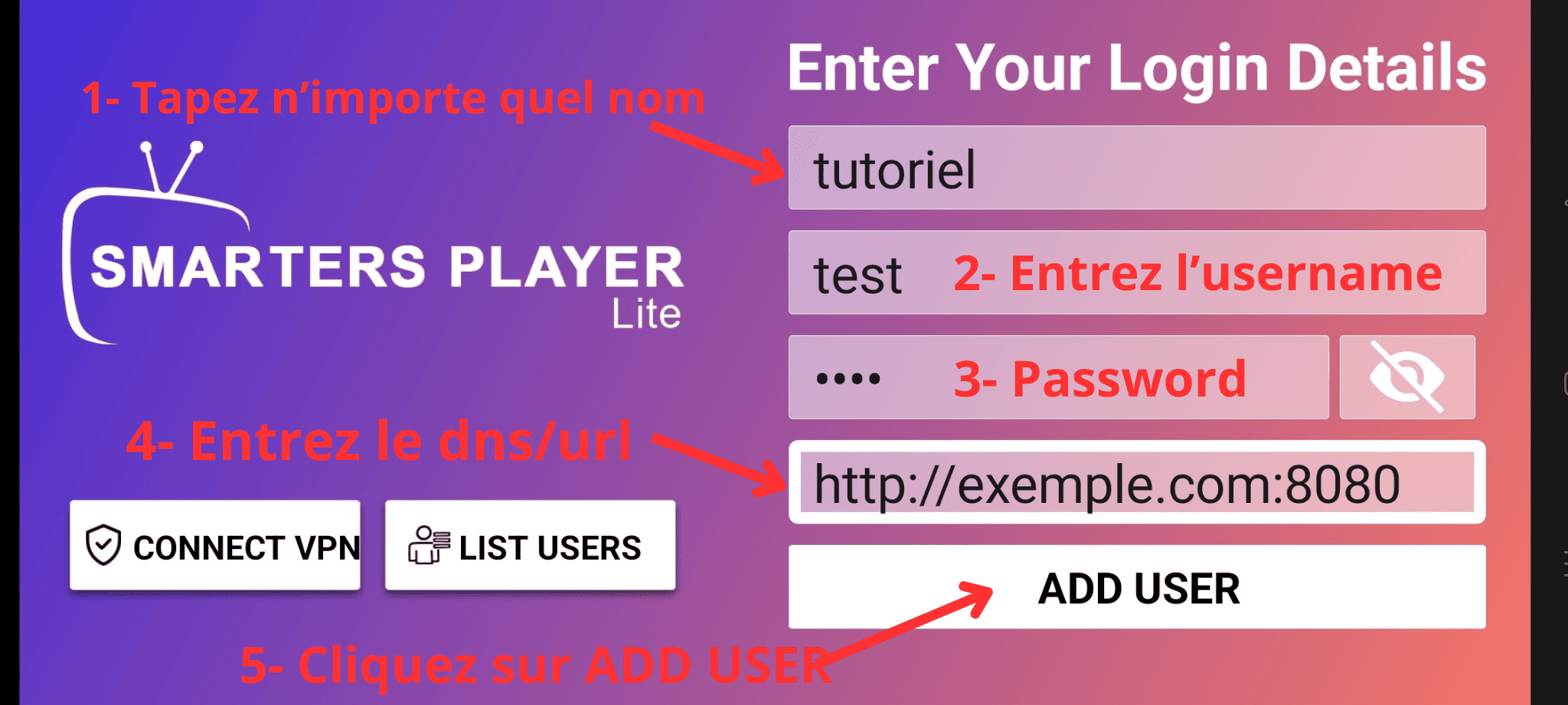 4- Dans le dernier champ, tapez le dns/host de l’abonnement.